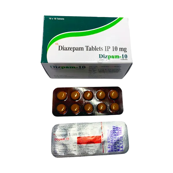 Diazepam Tablets IP 10mg, marketed under the brand name Dizpam-10, are a prescription medication used to treat anxiety, muscle spasms, and seizures. These tablets contain 10mg of Diazepam, a benzodiazepine that enhances the activity of certain neurotransmitters in the brain.